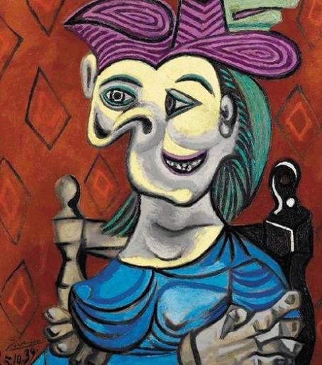 朵拉與小貓:畫中的女主角朵拉·馬爾,是西班牙著名畫家畢加索情人,她是一位超現實主義攝影師。1941年,畢加索以情人朵拉·馬爾為主角,將情人的形體畫得非常怪異,眼睛偏出頭部,既莊嚴又滑稽地坐在一張大木椅上,一只小黑貓躲在背后,這幅畫可以看到畢加索當時受到立體主義風格的影響。這是畢加索和朵拉·馬爾熱戀時創作的肖像畫之一,已經六十多年都沒有在公眾場合曝光。在2006年蘇富比春季印象派及現代藝術品拍賣會上,—露面就引起廣泛關注。多位重量級收藏家都出現在拍賣會上,經過多次叫價,最終以9521.6萬美元天價成交。