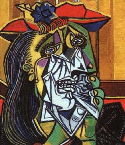 該作品畫面上是一張看上去雜亂無章的面孔,眼睛、鼻子、嘴唇完全錯位擺放,面部輪廓結構也全被扭曲、切割得支離破碎。作品表現了底層社會人們肝腸寸斷、痛苦無助的景象。該作是畢加索融合了立體主義與超現實風格的代表作。
