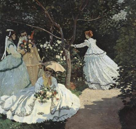 這幅油畫作品是著名畫家莫奈在19世紀末創作的一個作品,畫中突出四位美麗的淺色著裝女性,顯得特別的華麗高貴,使用了濃綠色,色彩大放光彩。