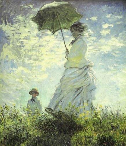 畫中畫出了一個美麗的婦女手里拿著傘,左側是個小男孩。這幅畫以綠,藍,褐為主色調,色彩顯得比較清新,是是19世紀末莫奈畫的一幅油畫。