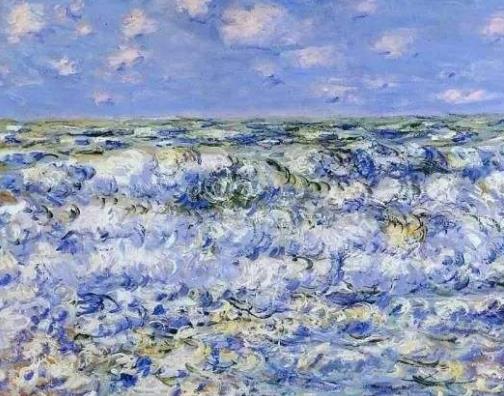 這幅畫看上去好美,表現法國海岸浪潮波濤的層疊翻滾和變換,色彩和動感強烈。是莫奈十大名畫之一非常的名貴。