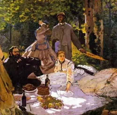 這幅畫是畫家莫奈在25歲的時候畫的一幅畫,這幅畫是在戶外的時候創作的,畫家運用畫上拉斐爾的女神和喬爾喬內的仙女成了女模特兒,其中一個裸體,另一個半穿著衣服。她們和兩個衣冠楚楚但顯然又“放蕩不羈”的波希米亞藝術家在樹林中消遣娛樂。此畫把人物置于同一類樹木茂盛的背景中,中心展開了一個有限的深度,中間不遠地方的那個彎腰的女子,成為與前景中的三個人物組成的古典式三角形構圖的頂點。