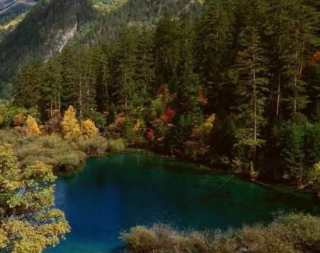 九寨溝湖水的顏色來源于湖邊風景的倒影,還有湖底的藻類和鈣化的巖石。秋季是游覽九寨溝的最佳時間,那時,湖面顏色紛繁絢麗,堪與畫家色彩豐富的調色板相媲美。