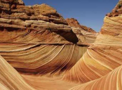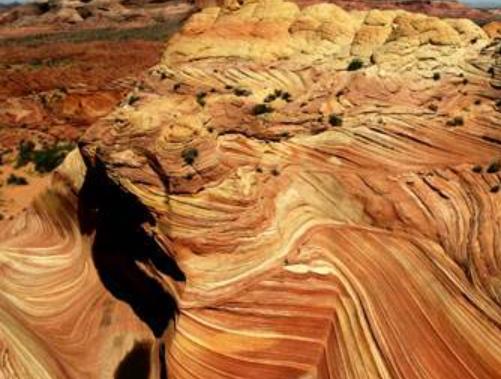 位于猶他州和亞利桑那州交界處的神秘石浪是由1.9億年前的沙丘演變而成。在不到200平方米的山間縫隙中,血紅的砂巖如海浪翻騰,剛和柔的奇妙結合令人嘆為觀止。順著砂巖的紋路觸摸著精致的波浪痕跡,仿佛還可以感受到億萬年前沙暴的精心設計和雕刻。