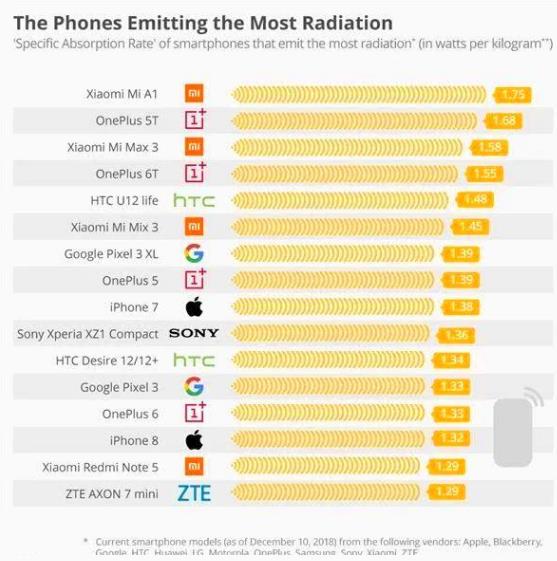 2018年手機(jī)最強(qiáng)輻射排名,小米A1輻射最強(qiáng),一加5T位居第二