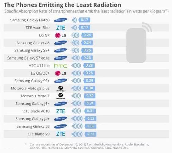 從輻射最低榜單中可以看出,輻射最低的3款手機分別是三星Note 8、中興Axon Elite和LG G7。在輻射最低榜的16部手機中,三星占據8款,包括三星note 8、A8、S8+、S9+等。中興有3款,LG有2款,連在國內幾近消失的摩托若拉也有2款上榜,HTC有1款。作為現在用戶數量非常多的蘋果和華為等品牌并未在榜單看到。