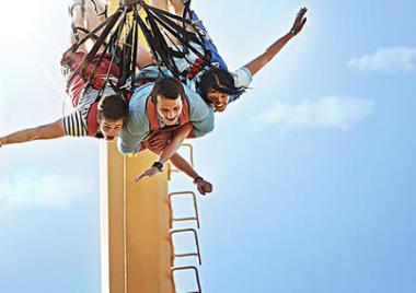 中國第一架蹦極塔,也是唯一一家市內蹦極場所。蹦極塔位于英東游泳館和綜合館之間的噴泉廣場上,與兩館互為呼應,蔚為壯觀,塔采用世界著名的美LAS VEGAS蹦極塔結構,高24米。有兩種方式可以選擇:一種是下方為氣墊,另一種下方為水池,晚場設有噴霧裝置。138元。