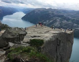 這塊石頭最驚險的地方就是周圍沒有任何保護,而且下面峽灣的蒸汽和云霧經常彌漫到石頭上面,所以有時候根本就看不到下面的情況。如果天氣晴朗,能看到下面反而更令人眩暈,石頭對面就是一個瀑布,下面的風絕對能把人吹的搖搖欲墜。所以即使是膽子大的有恐高癥的朋友千萬不要嘗試,這里據說死過人的。