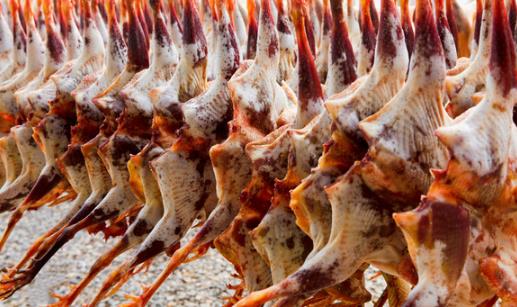 做這種東西時(shí),需要一定的手法,速度必須非?臁_@是藏菜,大師以極快的速度拔毛、取臟、填調(diào)料入雞腹、縫上、掛于通風(fēng)處(未放血?dú)⑺溃。這時(shí)雞必須還是活的,然后如風(fēng)鈴一般在風(fēng)雪之中“咕咕”直叫,其景慘不忍睹。