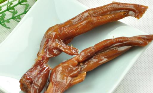烤鴨掌是以活鴨為主材的河北菜肴名,期發(fā)明者定州義豐(今河北安國)人,行五人稱五郎,白皙貌美,兼善音律歌詞?绝喺,活鴨放在微熱的鐵板之上,把涂著調(diào)料的鐵板加溫;铠喴?yàn)闊幔瑫?huì)在鐵板走來走去,到后來就開始跳。最后鴨掌燒好了,鴨子卻還活著,切下腳裝盤上桌,鴨子做其它用,煮成后的鴨掌美味無比。