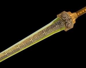 黃金色之千年古劍,傳說(shuō)是天界諸神賜予軒轅黃帝擊敗蚩尤之曠世神劍。其內(nèi)蘊(yùn)藏?zé)o窮之力,為斬妖除魔的神劍。眾神采首山之銅為黃帝所鑄,后傳與夏禹。劍身一面刻日月星辰,一面刻山川草木。劍柄一面書(shū)農(nóng)耕畜養(yǎng)之術(shù),一面書(shū)四海一統(tǒng)之策。軒轅夏禹劍體現(xiàn)了勇氣、智慧、仁愛(ài),一切歸于兩個(gè)字:圣道。