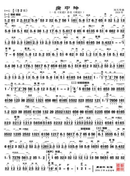 《病中吟》是二胡演奏家、教育家劉天華(1895-1932)的代表作之一。作者于1915年開始構思旋律,1918年完成,1930年發表。《病中吟》原名《胡適》,因與教育家、文學家胡適同名,遂改為《安適》。《安適》的意思是作者在貧困、失業的逆境中感到走投無路,就是“我講到何處去”,但是使人誤解為“安逸而舒適”,所以最后定名為《病中吟》。《病中吟》并非生病之意,而是作者心中苦悶如病,不知何去何從。《病中吟》與《除夜小唱》、《空山鳥語》于1993年獲中華民族促進會“華人20世紀音樂經典作品獎”。