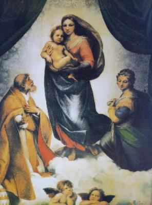 該畫為拉斐爾“圣母像”中的代表作,畫中人物和真人大小相仿,它以甜美、悠然的抒情風格而聞名遐邇。最初它被放在教堂的神龕上,至1574年,一直保存在西斯廷教堂里,故得此名。