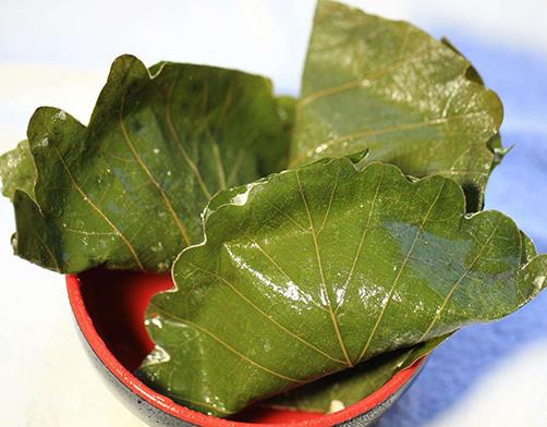 成品為一張秦皇島山區常見的餑欏樹葉,內裹小米淀粉作皮,以韭菜、豬肉等材料為餡,包成半圓形包子形狀,然后用當地的餑欏樹對折包裹而成,蒸熟即可儲存食用。正宗的桲欏葉餅使用野生山韭菜做餡。