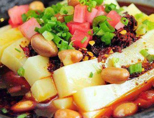 這是用大米和黃豆做的豆腐,顏色微黃,帶著米香和豆香。因為每家飯店的紅油配方不同,所以你在貴州可以吃到許多不同味道的米豆腐。