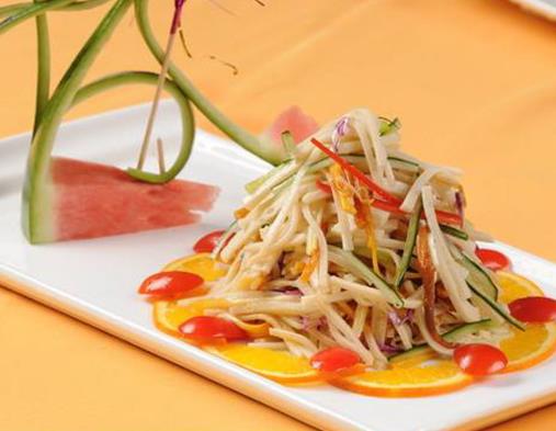 這道菜從造型到味道都非常特別,吃的時候需要把雞絲和下面的菜絲拌在一起,味道脆爽十足。
