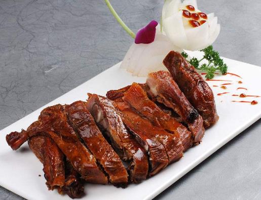 醬板鴨是以鴨、醬料為主,通過(guò)殺鴨、退毛、擦鹽、復(fù)腌、最后用谷草引火,撒上糠殼,待初燒青煙散去,將鴨子反復(fù)熏烘至金黃色即成的一道美食。