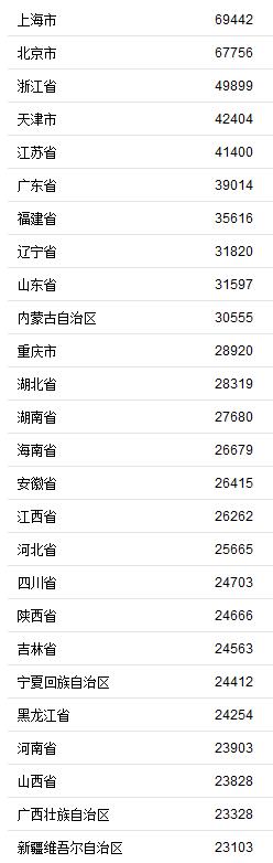 1、上海市,2、北京市,3、浙江省,4、天津市,5、江蘇省,6、廣東省,7、福建省,8、遼寧省,9、山東省,10、內蒙古自治區。