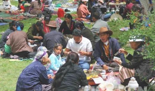 在挺拔的白楊樹下,綠蔭茵的草地上,美麗的河畔溪邊,都可見到身著艷麗服裝的藏族群眾,或合家而出,或約請親友,人們三五成群,在帳篷內狂歌暢飲,同時還玩耍藏棋、藏牌等游戲。