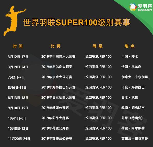 根據世界羽聯公布的2019年賽程來看,明年全年共計36站巡回賽。分別是1站世界羽聯總決賽,9站SUPER100級別,11站SUPER300級別,7站SUPER500級別,5站SUPER750級別,3站SUPER1000級別,比2018賽季的38站比賽減少了2站。
