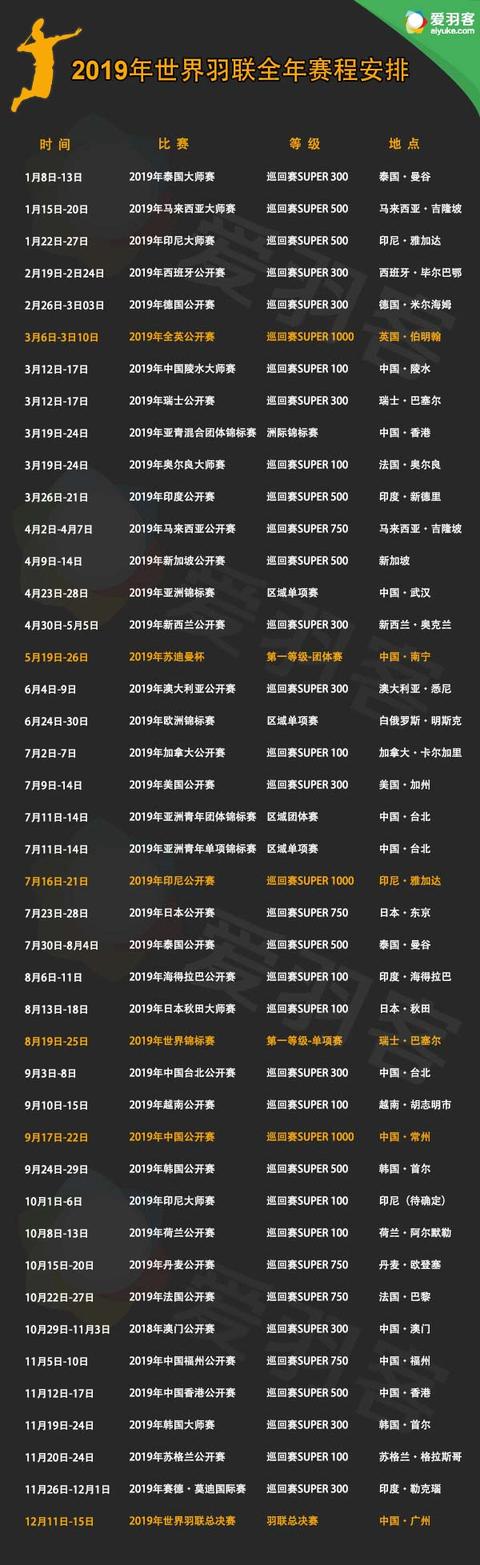 世界羽聯公布的全年賽程安排,看準時間地點,精彩不錯過。2019年,多項賽事落戶中國。下面,和360常識網一起看看吧。