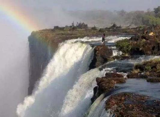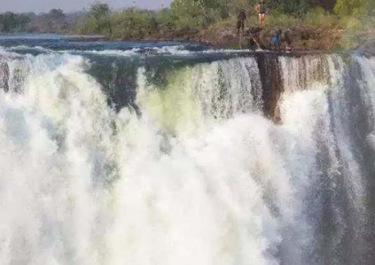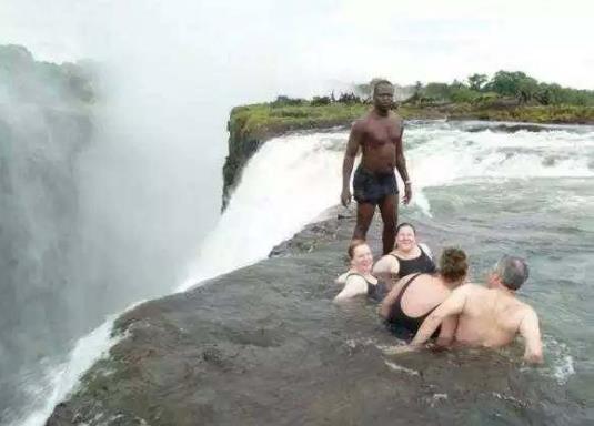 津巴布韋與贊比亞交界處維多利亞大瀑布頂部天然形成的“魔鬼游泳池”號稱世界上最驚險的泳池。懸崖邊凸起的巖石形成池邊,也是保護安全的唯一屏障。湍急的水流繞身而過隨即落下深淵,形成飛流直下三千尺之勢。