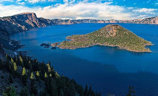 火山口湖是世界風光奇觀之一,位于美國俄勒岡州西南部,是美國最深的湖泊。湖面面積54平方千米,海拔1882米。最大深度94米。湖面變動小,湖水清澈,呈深藍色。由于火山多次噴發,形成若干火山錐,部分出露湖面即成為小島。