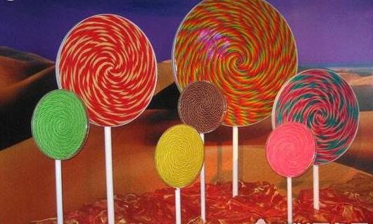 這個世界上最大的棒棒糖,是美國時思糖果和巧克力食品公司加利福尼亞伯林蓋姆的棒棒糖工廠制作的。這個棒棒糖光是糖果本身,就長1.4米、寬1米、高1.8米、棒長3.6米。據說這個棒棒糖畫了將近14個半小時,消耗了1337公斤糖,才制作完成。