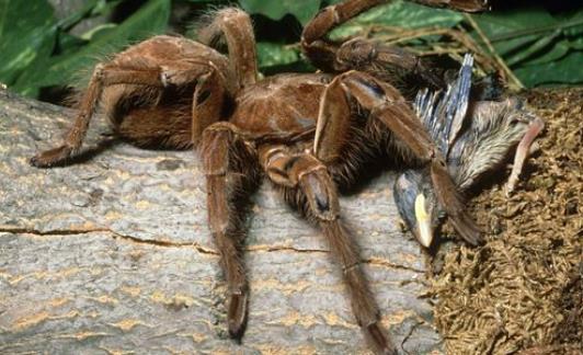 食鳥蛛是熱帶一種巨形蜘蛛,之所以稱其“巨形”,其一在于它的身體比其他蜘蛛大。是蜘蛛中的“巨人”,大小如拳頭(5-15厘米),四足外展時體寬可達20多厘米;其二在于它的胃口大,可以食鳥。蜘蛛是靠蜘蛛網來捕食的,食鳥蛛要吃到小鳥,它的網就非同一般了。食鳥蛛在樹林的樹枝之間結網,這種蜘蛛網很結實,能經得住300克的重量,不但是小鳥,就是小青蛙也落網難逃。食鳥蛛能分泌毒液,先將落入羅網的小動物毒死,然后慢慢享用。由于食鳥蛛的網大而結實,一些小昆蟲、小蜥蜴也不免落入羅網,食鳥蛛的胃口很大。對所有入網的獵物是來者不拒,統統吃掉。