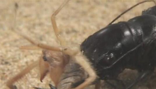 漏斗蜘蛛作攻擊狀,意圖先發制人。大王虎甲和它來個以攻對攻,雙方纏斗。大王虎甲很快壓制住漏斗蜘蛛,大王虎甲啃食漏斗蜘蛛,KO勝利。