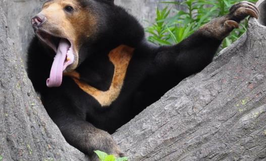 馬來熊(學(xué)名:Helarctos malayanus)為食肉目馬來熊屬下的一種小型熊類動物。是現(xiàn)存體型最小的熊,體長110-150厘米,體重27-75千克。全身黑色,體胖頸短,頭部短圓,眼小,鼻、唇裸露無毛,耳小而頸部寬。兩肩有對稱的毛旋,胸斑中央也有一個毛旋。尾約與耳等長;趾基部連有短蹼。胸通常點綴著一塊顯眼的"U"型斑紋,斑紋呈淺棕黃或黃白色。舌很長,適于舔食白蟻。爪鉤呈鐮刀形,善于攀爬。馬來熊是唯一不冬眠的熊亞科動物。主要分布在東南亞和南亞,在中國云南綠春以及西藏芒康有少量分布。生活在熱帶和亞熱帶森林中,性孤獨,白天在樹上休息,夜間活動,行動敏捷,善攀援。膽小,怕冷但不冬眠。雜食性,吃樹葉、果實、蜂蜜、昆蟲及小動物。約3歲性成熟,妊娠期7-8個月,每胎1-2仔。平均壽命約24年。為中國國家一級保護動物。