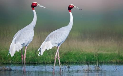 赤頸鶴(Sarus Crane)是大型涉禽,共分化為3個亞種。后趾小而高位,不能與前三趾對握,因此不能棲息在樹上;全身羽毛大致呈淺灰色,成鳥頸部裸露紅色的皮膚。初級飛羽和初級覆羽為黑色,白色而修長的內(nèi)側(cè)飛羽垂直的覆蓋著尾部。嘴灰綠而腳粉紅。棲息于多草的平原、水田、沼澤濕地及森林邊緣。以稻谷及水生植物的根、塊莖為食,也取食魚類和蛙類。7-12月份繁殖,筑巢于沼澤地帶成團的植物叢中,以水生植物莖、葉筑成。每窩產(chǎn)卵2枚,綠色或粉紅白色,具褐色和紫色斑點。雌鳥孵卵,雄鳥守衛(wèi),孵卵期30天,由雙親共同照料幼雛。分布于印度、緬甸、泰國、馬來西亞、澳大利亞和中國的云南盈江和西雙版納等地。
