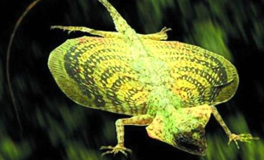 飛蜥主要分布在南亞和東南亞的熱帶雨林,在我國云南、海南等地也能看見它們的身影,主產(chǎn)裸耳飛蜥和斑飛蜥兩種。它們常在樹上活動(dòng),很少下到地面,以昆蟲為食。當(dāng)飛蜥在爬行或者休息時(shí),翼膜收攏而折疊于體側(cè)背方,在林間滑翔時(shí),翼膜會(huì)向外展開。