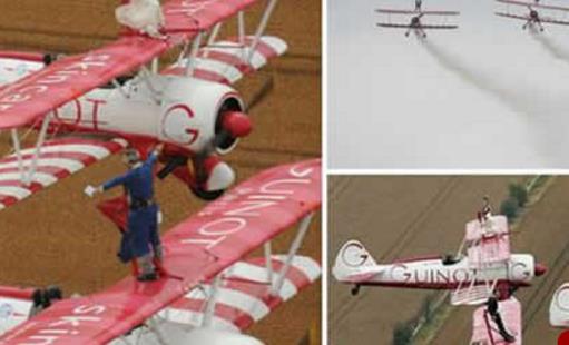 在這個(gè)世界上最大膽的婚禮上,中間的飛機(jī)上是牧師、新郎、新娘分別在左右的兩架飛機(jī)上,用固定支架綁住,婚禮在親友的注視下升空完成,這比泰坦尼克號(hào)上的"船頭爛漫"還要更勝一籌。