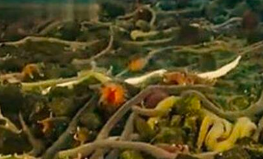 在為《生命》系列節(jié)目拍攝的這個(gè)海底場(chǎng)景中,大量無(wú)脊椎動(dòng)物蜂擁聚集到南極巨蟲(chóng)。一只沉入海底的死海豹身上,開(kāi)始瘋狂享用美餐。海豹尸體沉到海底的情況,也許每十年才能遇到一次。紐形蟲(chóng)可以利用鼻狀物在海豹的皮膚上鉆洞,這樣它們和樹(shù)虱(woodlice)等其他海生等足目動(dòng)物就能鉆到海豹體內(nèi)進(jìn)食。