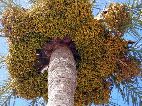 棗椰樹的花呈穗狀,從葉腋上長出來。一個花穗上往往有上千朵花蕊。花蕊呈白色,播粉流香。過去,雌雄花授粉,全憑自然風(fēng)吹或昆蟲采蜜,F(xiàn)在,人們懂得科學(xué),大都實(shí)行人工授粉;ㄩ_季節(jié),我們經(jīng)常看到,一些年輕人身系繩索,爬到樹梢,先將雄性花粉采集。然后,再爬到一棵又一棵雌性樹上,將花粉撒播。通過人工授粉,雌株受精得到保障,有助于提高椰棗產(chǎn)量。據(jù)說,一棵雄株的花粉可供四五十棵雌株使用。在大的種植園,果農(nóng)總是根據(jù)這個比例,將多余的雄株砍掉,以便把更多的精力和物力用來經(jīng)營雌株。
