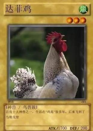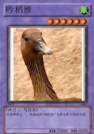 網友杜撰的十大神獸之一,傳說清朝康熙年間,突然一只大雁俯沖而下把整塊稻田都壓壞,形成了稻田怪圈,使當地農民得上一種怪病。農田里的女人很快變老,男人因為女人的變老,也離開了此地,是以百姓苦不堪言。最后官府下令捕殺吟稻雁,怪病才得以平息下來,但是吟稻雁因為過度捕殺導致滅絕,謖敗與甄姬之手(甄姬玩家總摸到紅牌,就是月經手)而得名。