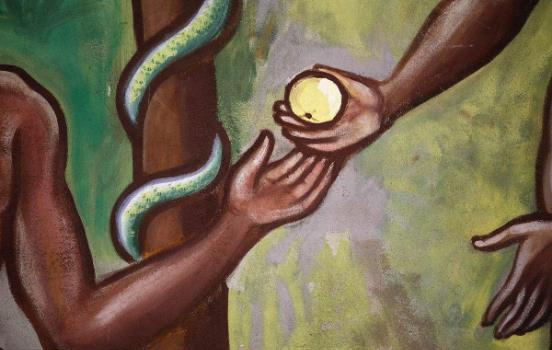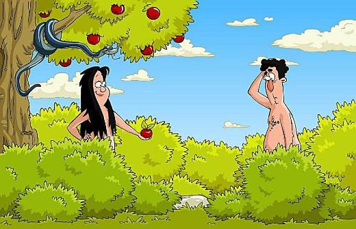 出自《圣經》。亞當和夏娃住在伊甸園中,上帝允許他們食用園中的果實,惟獨知善惡樹上的果實不能吃。狡猾的蛇引誘他們吃了禁果,違背了與上帝的約定,犯了罪。上帝因此將他們逐出伊甸園。