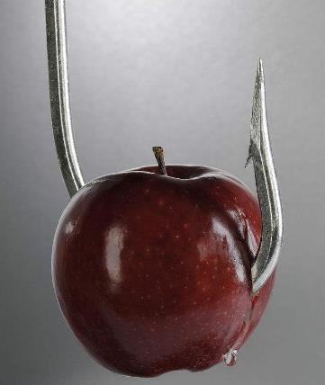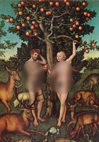 亞當、夏娃在園子里當然過的是天堂里的生活。然而所有游戲都要有規則來約束,我們的始祖也不例外,因此上帝給他們發了一個禁令:無論如何不可摘取園中那兩棵樹上的蘋果來吃,否則必遭天譴。唉,也是天意難違,園中藏一毒蛇,據說是撒旦(Satan)的化身。他心腸歹毒,說的倒是實話。他告訴夏娃,說那兩棵樹一棵喚作智慧之樹,吃其果可以聰明如上帝;另一棵喚作生命之樹,吃其果可以長生如上帝。據說那蛇說的是阿拉伯語(世界上最有說服力的語言),再加上蘋果之色澤確實鮮艷誘人,那婦人也就沒有多想,便從智慧樹上摘了個蘋果來吃。只因夫妻感情不錯,于是又將余下的部分拿去給亞當吃。因此后世認為蘋果能代表愛情,而西紅柿則更有“愛情的蘋果”之美名,美國紐約的別名則為“大大的蘋果”。還有啊,據說由于此果之來源有問題,所以亞當在吃的時候有一塊蘋果卡住了喉嚨,后來我們就把人類喉結直接稱為是“亞當的蘋果”(Adam’s apple)。兩人在吃下蘋果之后,便有了上帝的智慧,同樣也便有了羞恥之心。見彼此都赤身裸體的不成體統,于是摘了無花果(fig)的葉子來遮羞,打那時起人類才有得衣服穿。所謂獎懲要分明,上帝更不會姑息養奸。于是亞當、夏娃及那條蛇各領其罰。