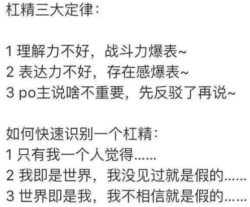 生活中,你提出對問題一些看法,總有一堆人來挑釁你的,杠精往往是反對人而不是反對觀點,他們并不真正關心事實的觀點,只是對人不對事,也就是說的“為反對而反對”,這類人以抬杠為己任,甚至明顯自己錯漏百出之后必定會搬出三大萬能擋箭牌出來: