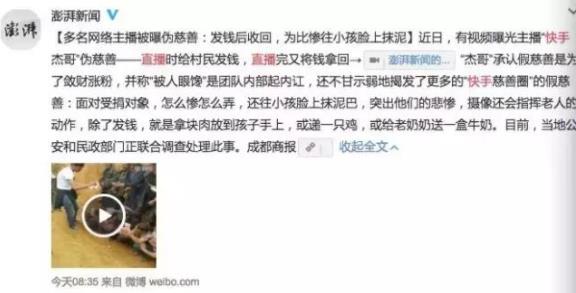 而要想上熱門至少需要10000以上的雙擊點贊,這也就是為什么很多人都用跪求、蒙騙、激將、刷禮物等各種方式誘使你雙擊666。而網絡和淘寶上也充斥了各種上熱門教程與刷粉絲雙擊播放的廣告。“快手”網紅月入百萬的背后,陸續出現很多相關負面的新聞,“偽慈善”“真腦殘”,讓這個平臺被打上了許多負面的標簽,更有網友們直言“腦殘千千萬,快手占一半”。博眼球搏出位的方式不可取,祝福大家直播需謹慎,且播且珍惜。